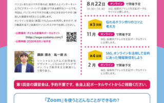 2020年11月6日開催の第2回 居場所と地域がつながる「マッチング交流会」及び、第3回 子どもの居場所に必要な講習会について、ご案内いたします。 講習会とマッチん交流会は、Zoomのミーティングアドレスが異なりますので、ご注意ください [...]