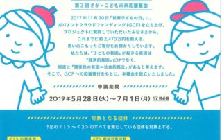 さが・こども未来応援プロジェクト実行委員会では、子どもの居場所づくりや子ども本人や親を取り巻く環境づくり、居場所づくりのための人材育成を支援する助成金を募集しています。 ↓ 【募集期間】2019年5月28日(火)~7月1日(月)17時必着 【助成金額】助成対象A:上限20万円(最大20件) 助成対象B:上限40万円(最大 [...]